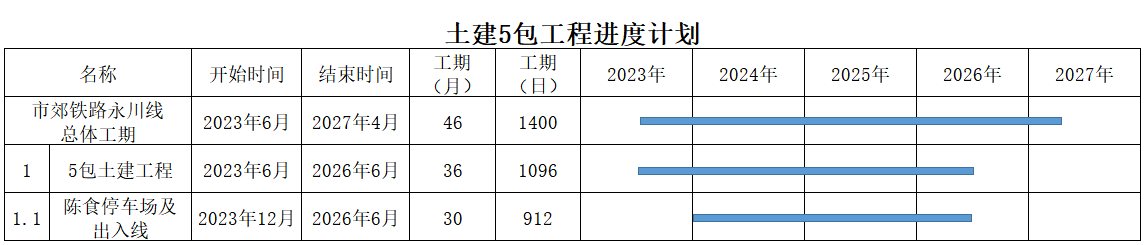 市郊铁路重庆中心城区至永川线工程计划施工总工期60个月。本招标项目计划于2023年6月30日开工,计划1096日历天按合同约定实施和完成本承包工程。