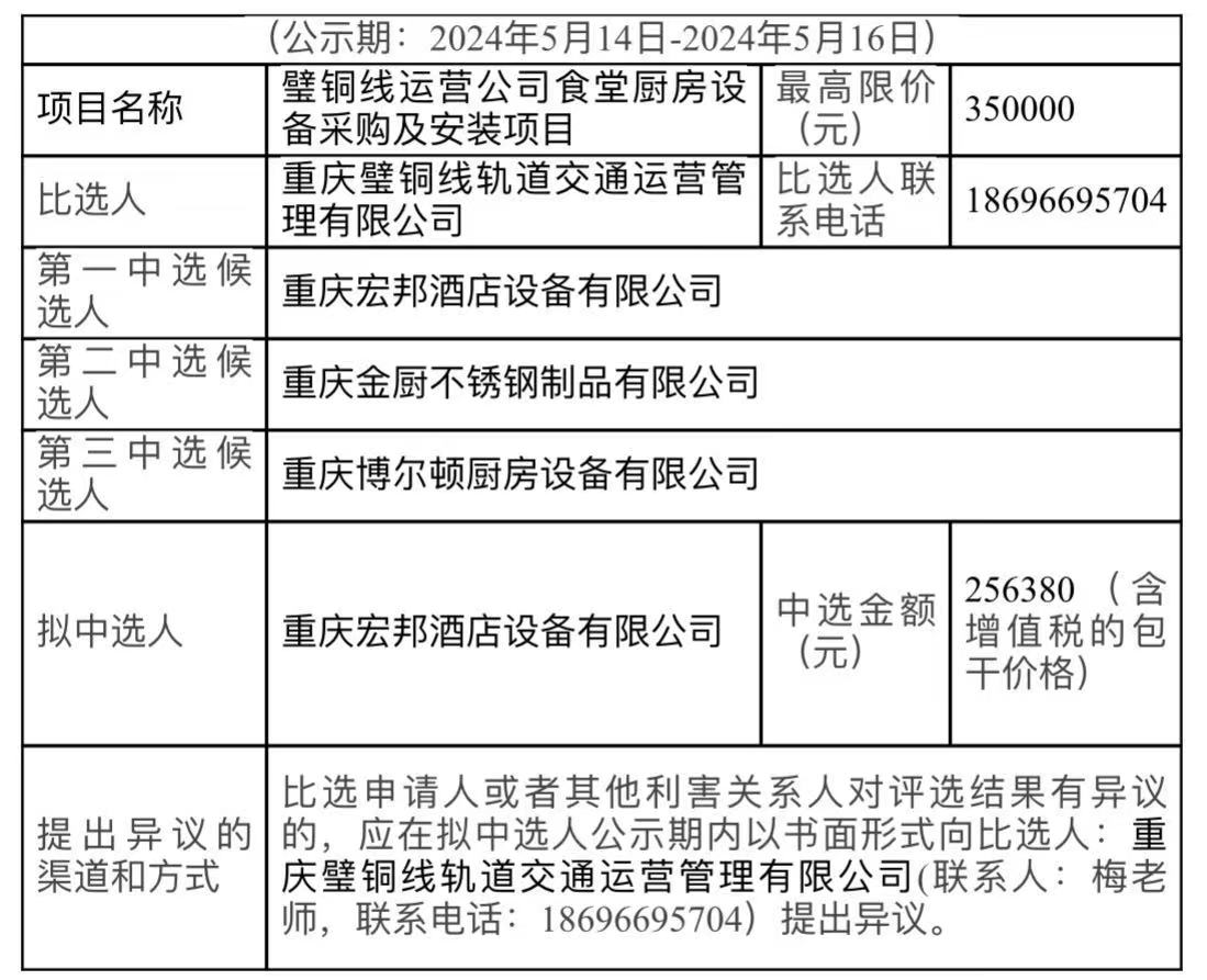 璧铜线运营公司厨房设备采购及安装项目竞争性比选结果公示表