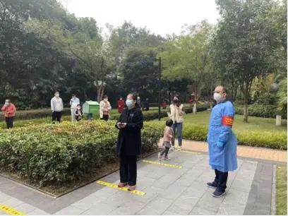 7时许,尹鹏飞熟练穿好防护服,戴好口罩和手套,开始仔细消毒。一身行头齐备后,他正式开始了上午的工作:在小区内布置检测点位、确定安全距离、安排志愿者、维持现场秩序;在疫情监测卡点,劝返出入区人员,对确需入区的人员告知“人员只进不出的”管控措施,同时做好询问来去、记录时间、测量体温等各项信息登记;一遍又一遍地给居民重复着“保持一米距离”“做完核酸不要逗留马上回家”的提醒……他的动作有条不紊、回答耐心细致。一整套流程下来,已是下午2点。