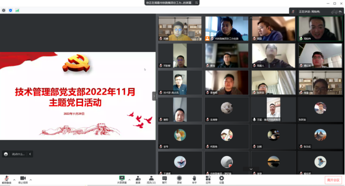 为进一步深入学习贯彻党的二十大精神,大力弘扬伟大抗疫精神,11月29日上午,集团技术管理部党支部组织线上开展“聚焦二十大 奋进新征程”主题党日活动。活动由党支部书记周灿伟主持,集团党委委员、总工程师王猛及支部全体党员、入党积极分子参加。
