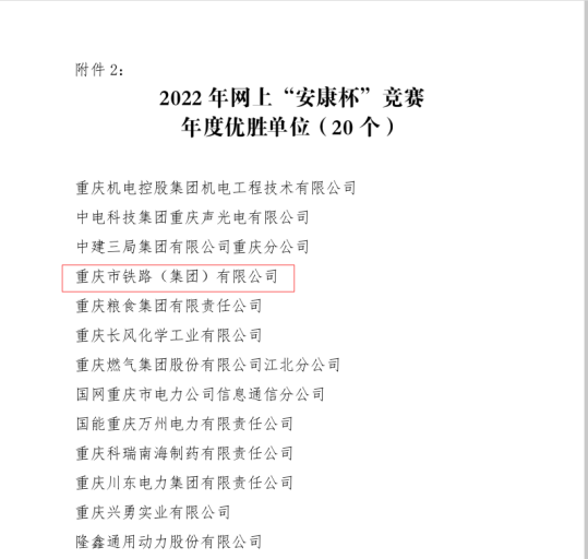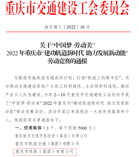 近日,重庆市交通建设工会对“建功轨道新时代 助力发展新动能”劳动竞赛的优秀集体、班组和个人进行了表彰,凯博赌场 荣获“优秀集体”,城轨快线15号线项目部、27号线项目部获“优秀班组”,6人分别获得“优秀个人”“优秀组织奖(个人)”。
